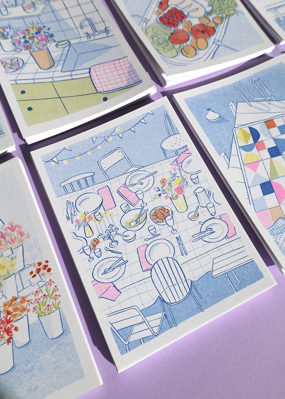 Postcard. Risography print on Munken White paper 300g. 4 colors risography : blue – red – yellow – fluo pink. A6 (10.5×14.8cm). Printed in Brussels by Rdryer Studio.