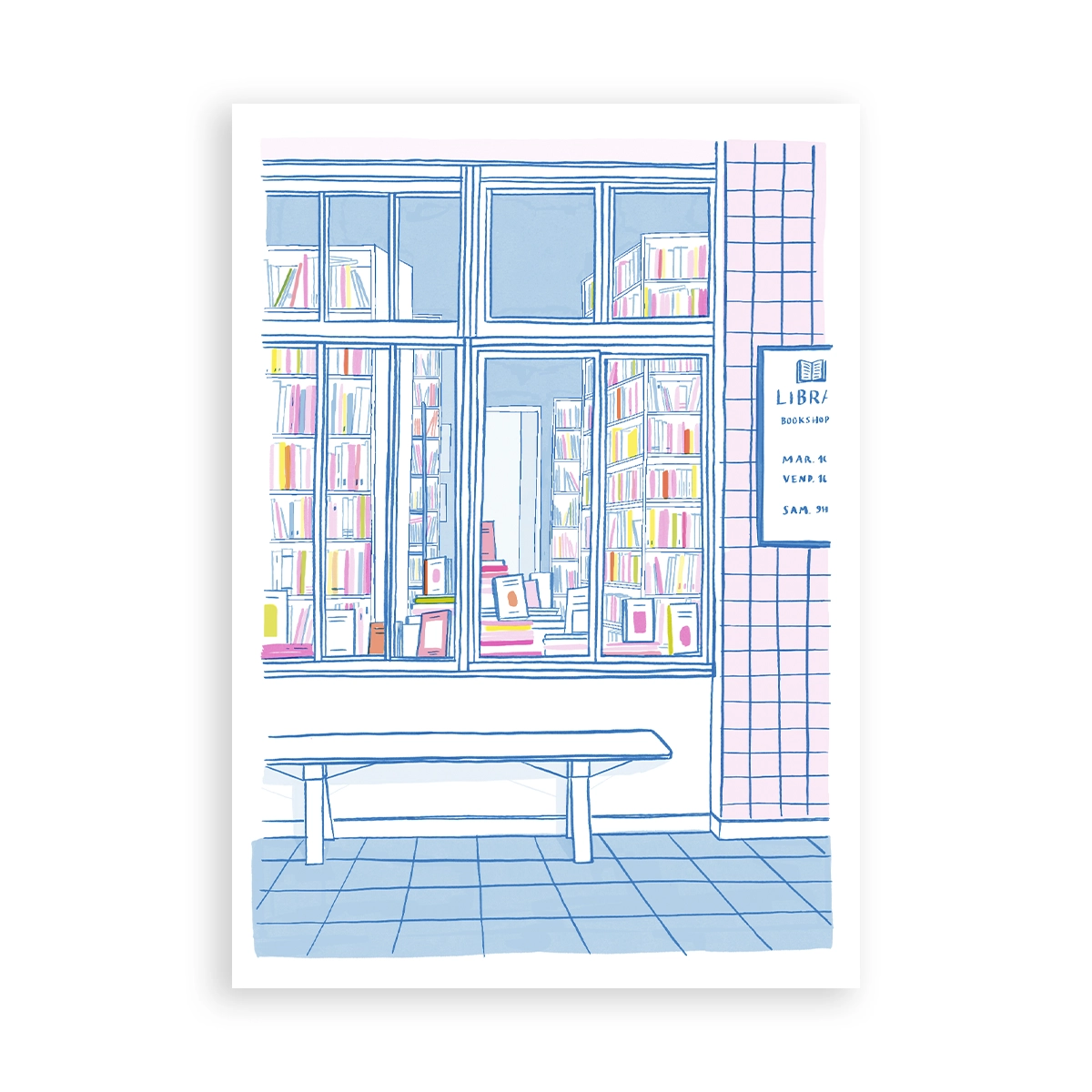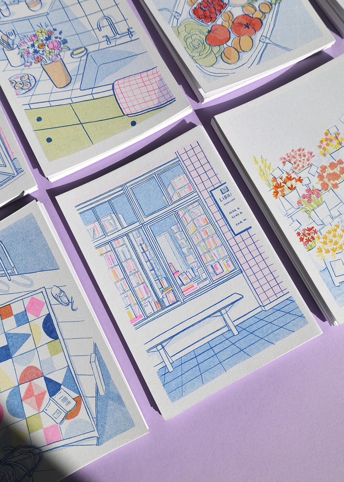 Postcard. Risography print on Munken White paper 300g. 4 colors risography : blue – red – yellow – fluo pink. A6 (10.5×14.8cm). Printed in Brussels by Rdryer Studio.