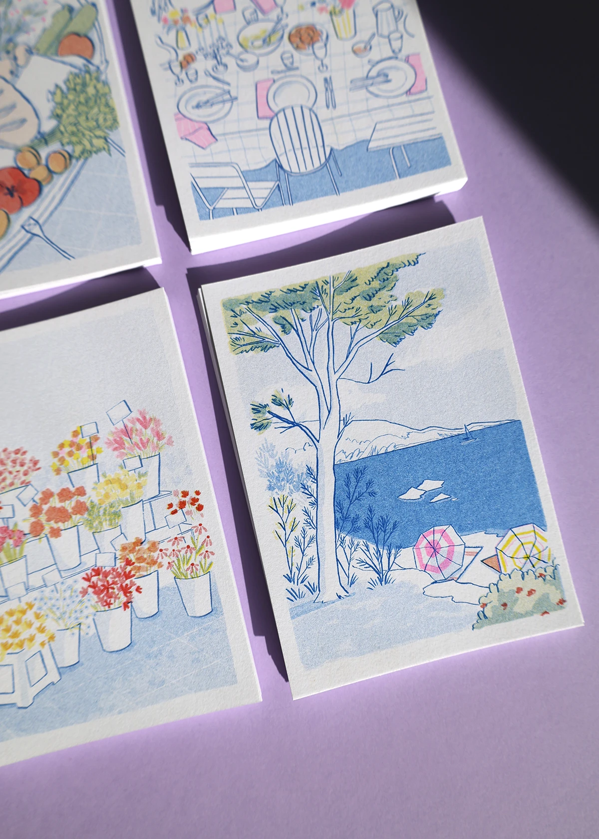Postcard. Risography print on Munken White paper 300g. 4 colors risography : blue – red – yellow – fluo pink. A6 (10.5×14.8cm). Printed in Brussels by Rdryer Studio.