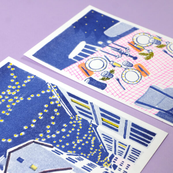 Carte postale imprimée sur papier Munken White 300g. Risographie 3 couleurs : bleu medium – rose fluo – jaune. Format A6 (10.5×14.8cm).